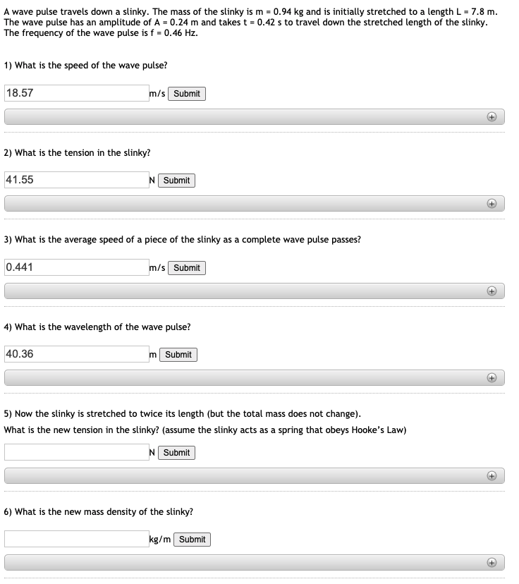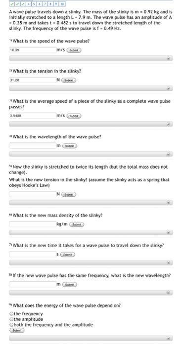 The wave pulse has an amplitude of A 023 m and takes t 0448 s to. The mass of the slinky is m 092 kg and is initially stretched to a length L 78 m. The mass of the slinky is m 087 kg and is initially stretched to a length L 68 m.
